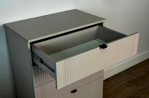 Комод изготовлен из качественных материалов: корпус выполнен из ЛДСП, что гарантирует прочность и долговечность, а фасад, выполненный из МДФ в плёнке ПВХ, не только выглядит эстетично, но и защищает комод от повреждений. Особое внимание заслуживает фрезеровка фасадов, которая придаёт изделию изысканный вид.